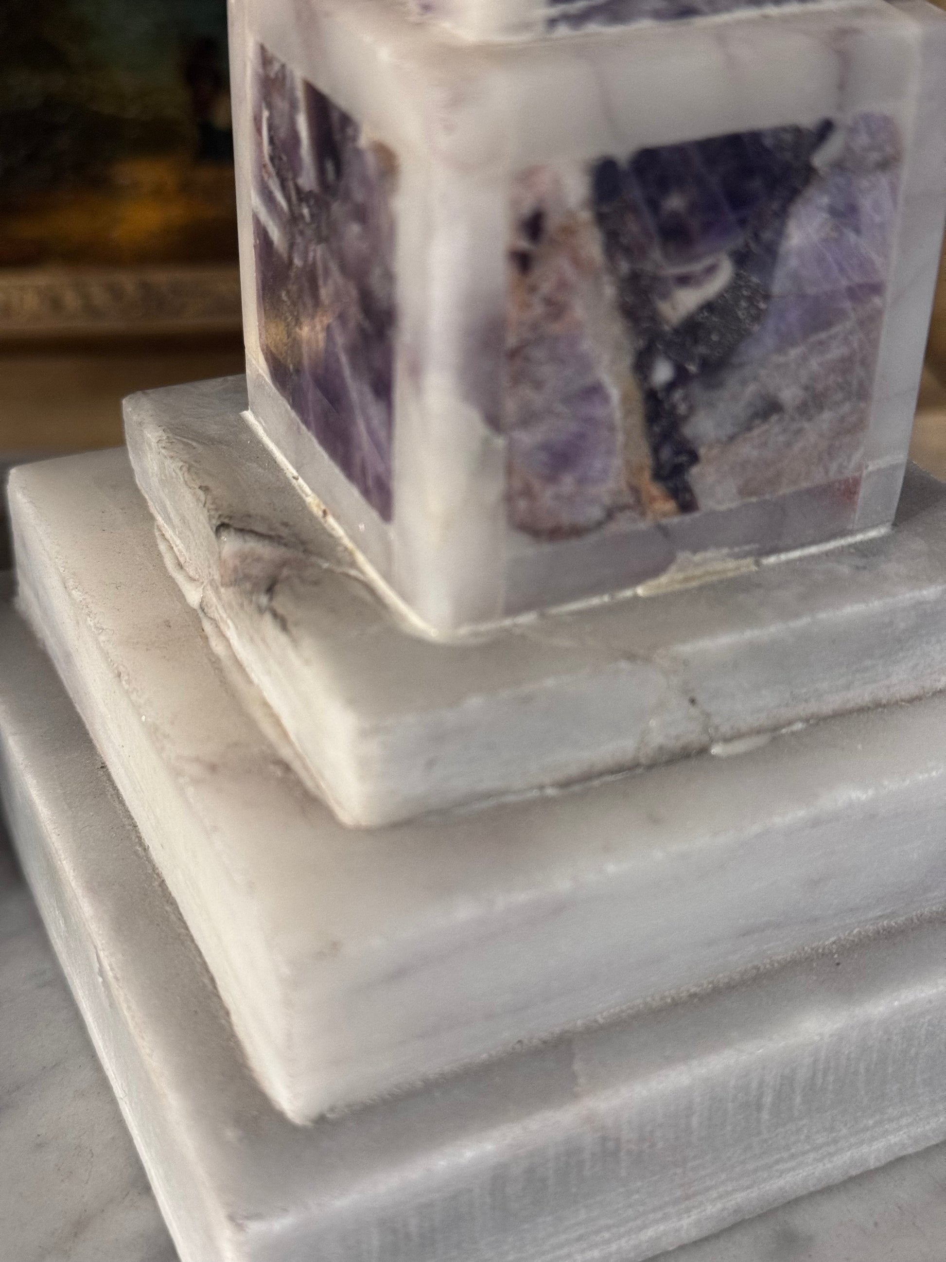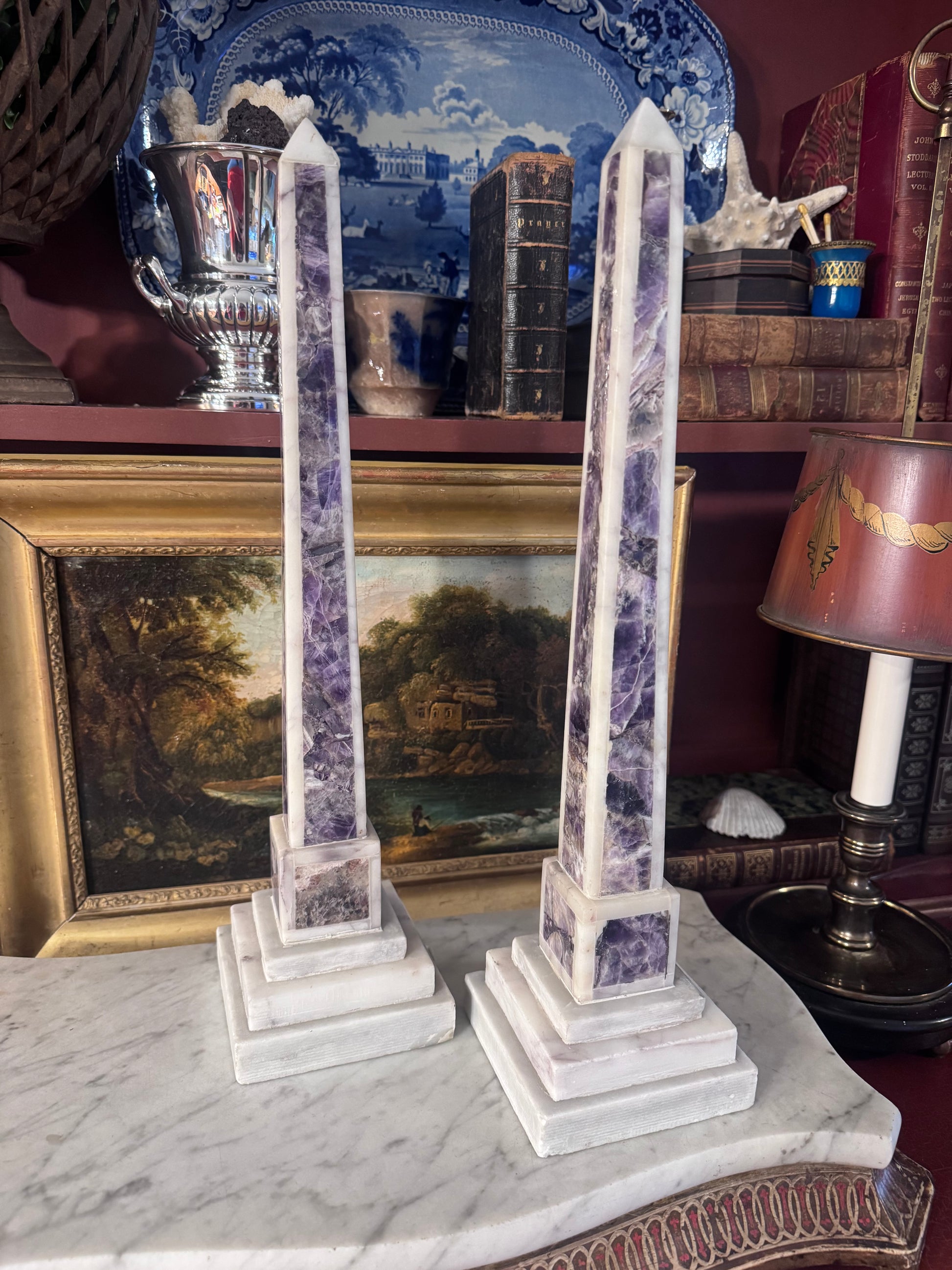 Obelisks have long symbolized permanence and refinement, and pairs like this were often used in European interiors to anchor mantels, libraries, and grand case pieces. The amethyst displays beautiful natural variation in tone and crystalline movement, while the marble bases provide balance and substantial weight. Sculptural and beautifully proportioned, they make a powerful statement whether styled symmetrically or layered among silver, books, and framed art.