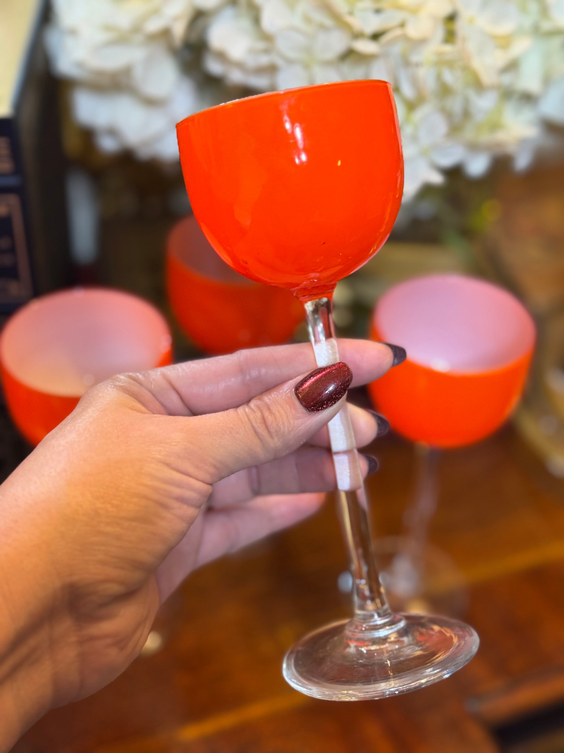Crafted in Moretti’s signature mid-century style, these glasses feature a vivid orangey-red opaque bowl contrasted by a clear slender stem and foot. The color glows warmly in the light, making them an eye-catching addition to any tablescape or bar.